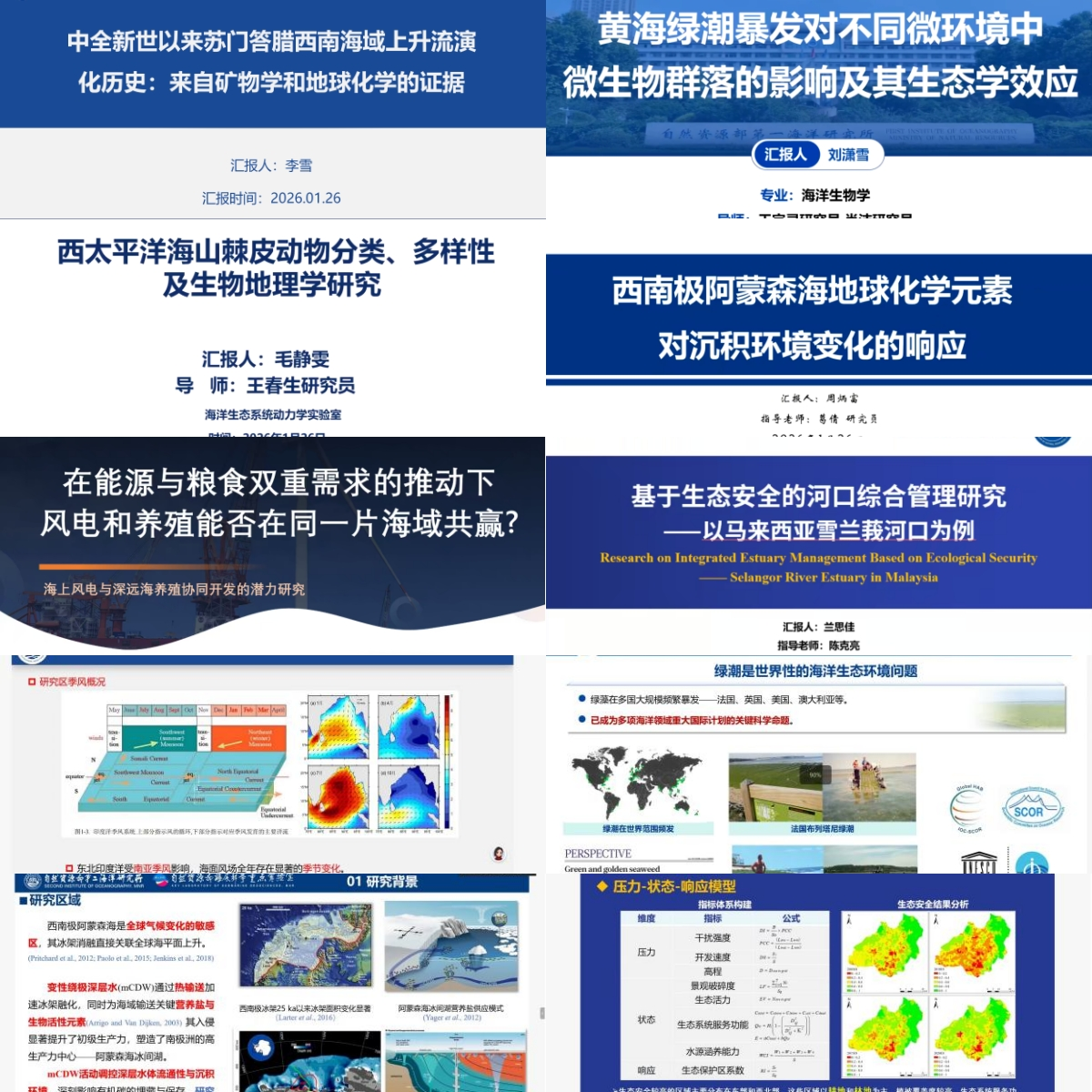 本次论坛共有六场研究生学术报告,内容紧密围绕海洋科学前沿议题展开,包括利用矿物与地球化学证据解析苏门答腊西南海域中全新世以来上升流的演化规律;探究黄海绿潮暴发对不同微环境微生物群落的影响机制;聚焦西太平洋海山棘皮动物的分类、多样性及生物地理学特征;探讨阿蒙森海地球化学元素对沉积环境变化的响应机理;评估海上风电与深远海养殖的协同开发潜力以及提出基于生态安全的河口综合管理研究框架。这些报告覆盖了从基础研究、技术攻关到管理示范的多层次方向,充分展现了海洋领域青年学子的创新活力与研究深度。