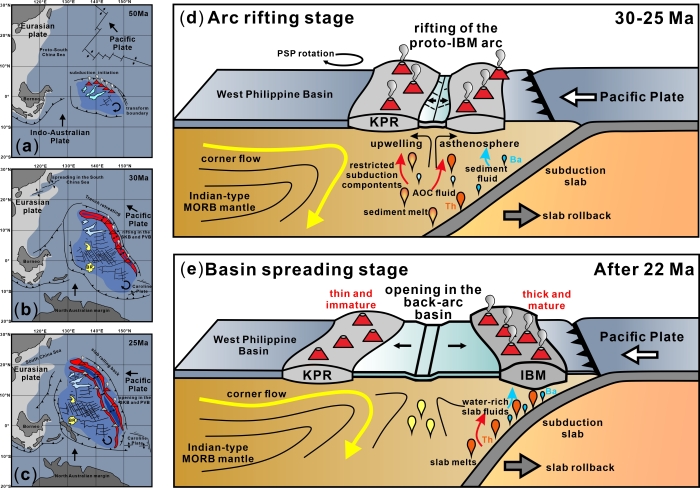 针对上述问题,研究团队综合利用国际大洋钻探计划、中-德联合航次、海洋一所和海洋二所执行的西太平洋专项等地质地球物理调查航次中所获取的九州-帕劳脊南段基底岩石样品,系统开展了年代学、岩石学和地球化学分析研究,获得了以下关键认识:九州-帕劳脊南段熔岩的地幔源区具有显著的不均一性,暗示了九州-帕劳脊弧下地幔经历了复杂的地质过程;与九州-帕劳脊北段相比,九州-帕劳脊南段熔岩中来自俯冲板片输入物质的贡献信号显著减弱(图1),显示出与婴儿期IBM弧岩浆相似的地球化学特征。并且,本研究创新性地提出了九州-帕劳脊演化的概念模型(图2),指出菲律宾海板块自身运动学特征(如板块旋转)与区域伸展应力共同控制了古IBM弧的裂解过程,伸展背景下弧下软流圈物质的被动上涌可能阻碍了俯冲组分对九州-帕劳脊弧下地幔的持续改造,进而中断了九州-帕劳脊向成熟岛弧的演化进程。该研究以岩石地球化学视角,系统揭示了九州-帕劳脊南、北段在岛弧初始裂谷向弧后扩张的过渡阶段所表现出的差异性岩浆作用,并为“九州-帕劳脊是不成熟的洋内弧” 的基底属性提供了坚实的、直接地球化学证据。