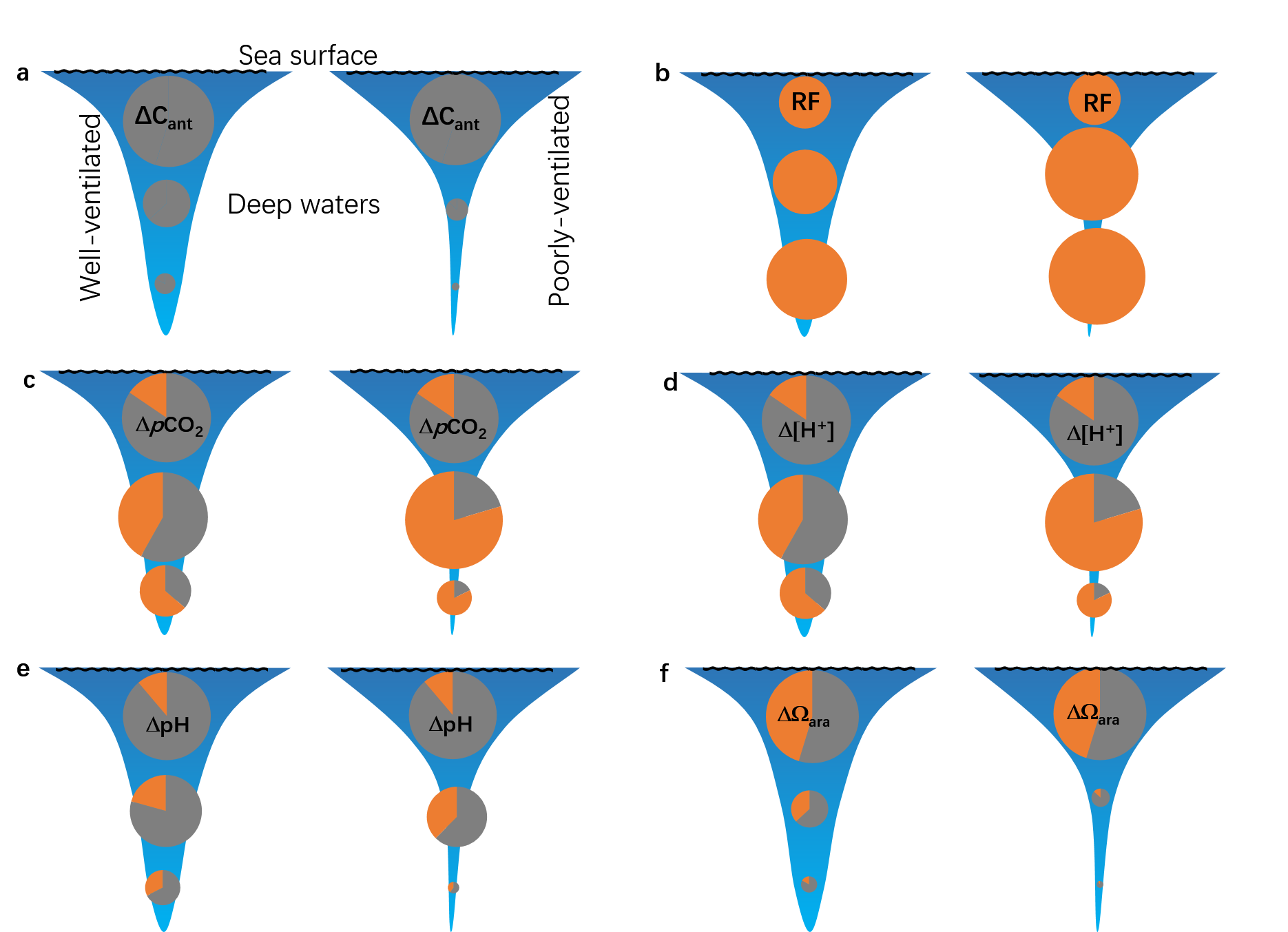 图1不同通风条件下水柱中人为CO2累积(ΔCant)及酸化指标变化示意图。图(a)至(f)分别表示ΔCant(a)、碳酸盐缓冲因子指数RF(b)、二氧化碳分压变化ΔpCO2(c)、氢离子浓度变化Δ[H⁺](d)、pH变化ΔpH(e)以及碳酸钙饱和度变化ΔΩara(f)的垂向分布。图中蓝色背景反映垂向通风的相对强弱;饼图的大小对应ΔCant、RF及各酸化指标的变化幅度。其中灰色部分表示在与表层海水相同缓冲能力下,由ΔCant直接引起的酸化指标变化,橙色部分则表示缓冲能力差异所引起的变化。