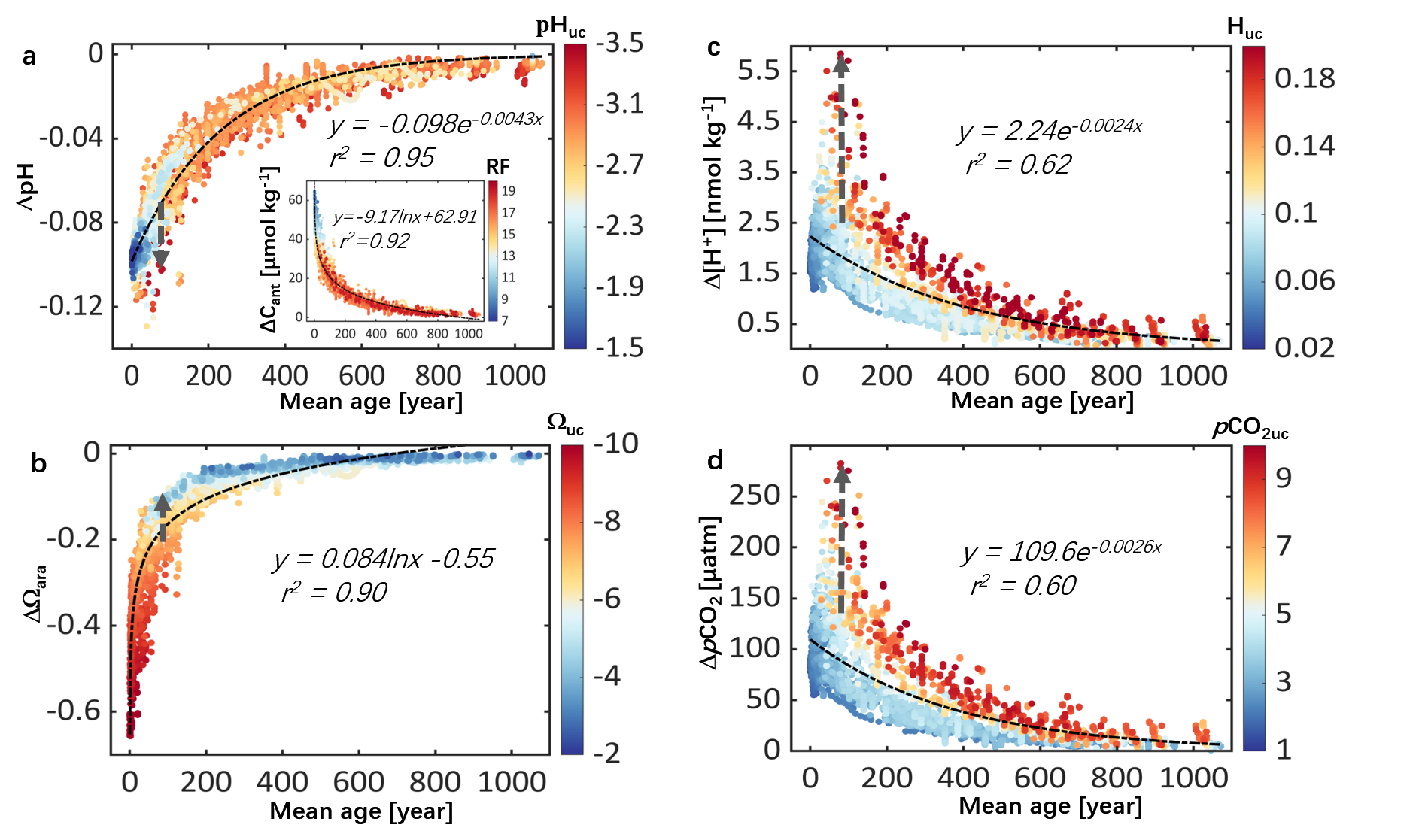 图 2水团年龄与ΔpH(a)、ΔΩara(b)、Δ[H⁺](c)和ΔpCO2(d)的相关性。其中,pCO2uc, Huc, pHuc and Ωuc分别表示单位人为CO2增加引起的酸化指标的绝对变化。