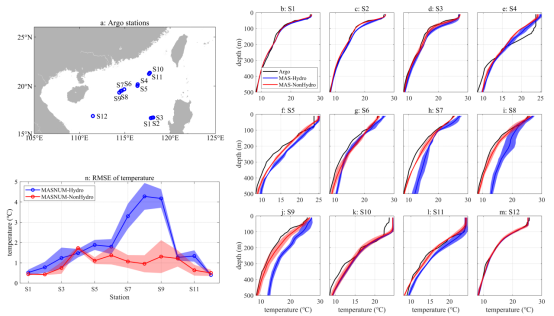 其次,针对南海多尺度海洋动力过程相互作用研究的需求,构建了南海北部公里级(水平分辨率为1/90°,垂向75层)非静力海洋环流模式。与实测资料的对比结果显示,相较于静力近似模式,非静力模式模拟的垂直流速普遍更强,能够揭示更多且更精细的小尺度动力过程。非静力模式模拟的温度剖面相较于静力模式更贴近Argo观测数据(图2),尤其在吕宋海峡以西、内潮活跃的区域表现显著,表明在海洋环流模式中引入非静力动压项能够有效提升温度垂向结构的刻画精度。