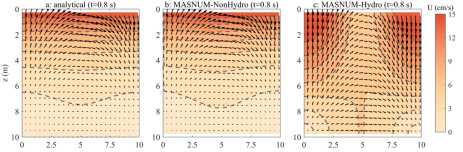 图1 a:理想实验中流场断面在0.8s的解析计算结果;b:非静力海洋模式的模拟结果;c:静力海洋模式的模拟结果