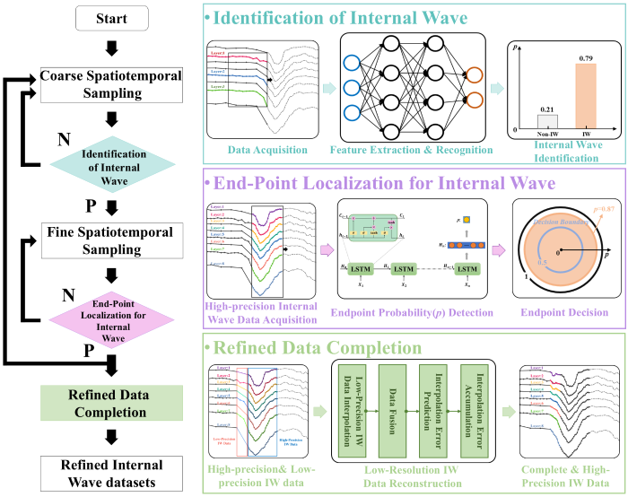 针对上述问题,研究团队创新性地提出了一种“低耗监测—智能触发—精准捕获—数据优化”的闭环观测策略(方法结构图如图2)。该系统通过内波识别模块、结束点检测模块与数据补全模块的协同工作,在常规状态下采用低分辨率采样以节约能源,一旦检测到内波信号,则自动切换至高分辨率模式,确保关键数据的完整获取。