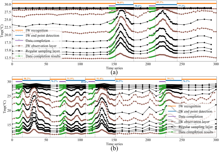 实验基于安达曼海白龙浮标实测温度剖面数据开展,结果表明:内波识别模块采用4个观测层和3分钟采样频率时,整体识别准确率达95%,延迟为8.095分钟。在引入考虑时间不确定性的建模方法后,波动结束点的判断准确率提升了71.9%。同时,数据补全模块的均方根误差(RMSE)低至0.1596℃。上述数据共同验证了本方法的可靠性,系统整体检测内波的效果如图3所示。系统整体测试结果亦显示,该策略在复杂海洋环境下仍能保持稳定、高效的数据采集性能。