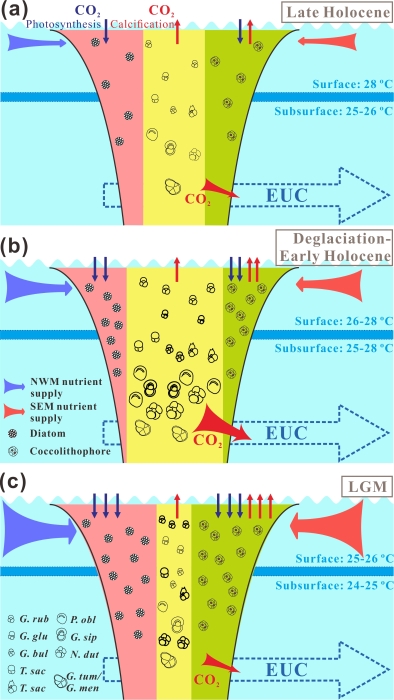 图2 热带西太平洋末次冰盛期-全新世生物泵演化的概念模式图