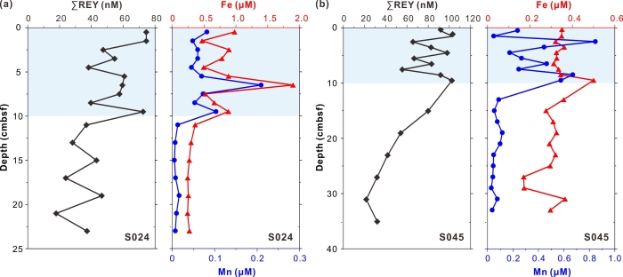 图1 研究站位孔隙水稀土元素(∑REY)及Fe、Mn浓度的垂向分布